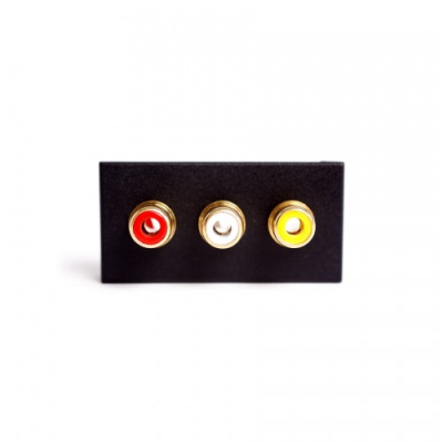 Triple phono rca black euro module presented with sockets on the front and solder tags on the rear.