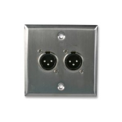 Single gang 3 pole XLR wall plate with two plugs presented on the front of the faceplate outlet