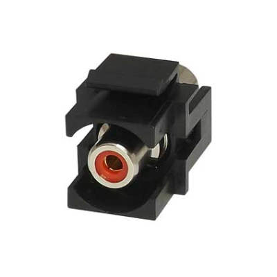 Red RCA keystone connectors designed to provide an easy snap-in mounting into a keystone patch panel.