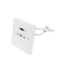 HDMI and USB A-A wall plate presented with female sockets on the front and rear of the wall plate.