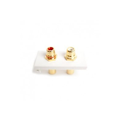 Twin RCA white euro module for stereo phono audio connections, presented with sockets on the front and the rear.
