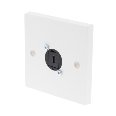 USB Type C plug and play wall plate outlet presented with socket connections on the front and rear of the faceplate.