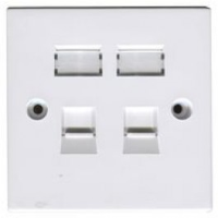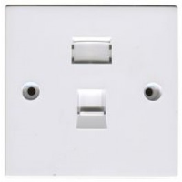 Single gang wall plate presented with a CAT5e socket. For additional security and improved appearance the CAT5E network socket is supplied with screw caps to discourage unauthorised tampering. The shuttered front aperture protects against ingress of dust. A ‘slip-in’ labelling field is located above each outlet for port identification.