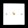 A plastic white wall plate with a yellow phono socket. Commonly used for amplifier to subwoofer connection.